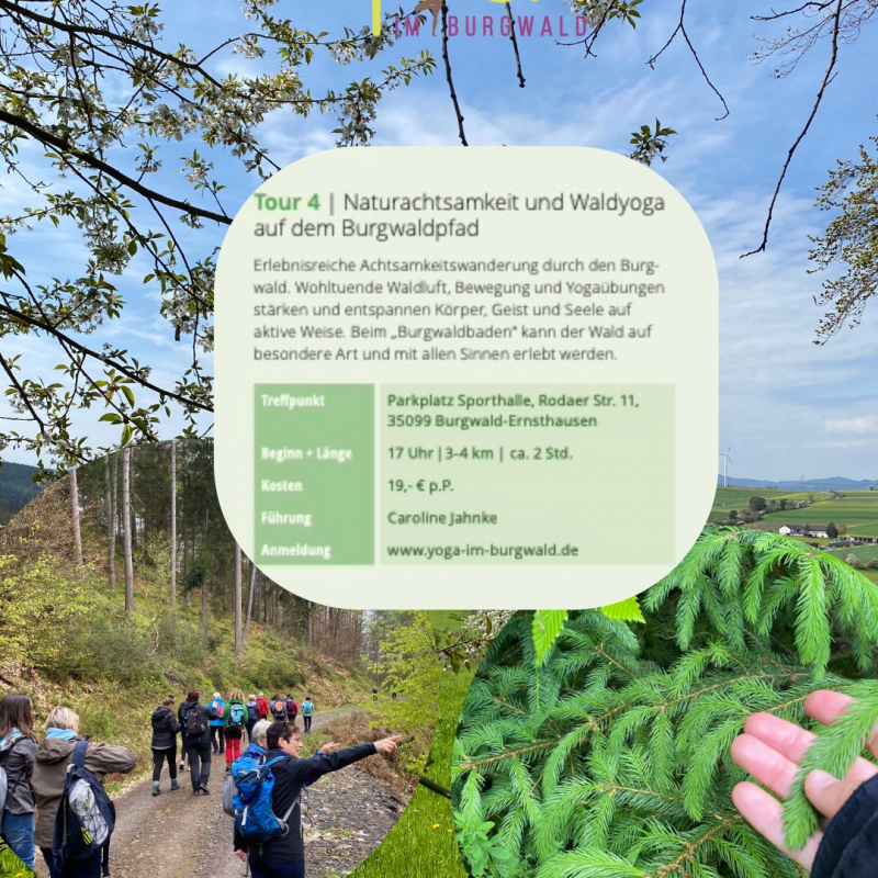 Auf der Wanderung atmest du die wohltuende Waldluft, stärkst und dehnst deine Muskeln durch das Wandern und Yogaübungen im Stehen (ohne Matte) und entspannst dabei auf aktive Weise.